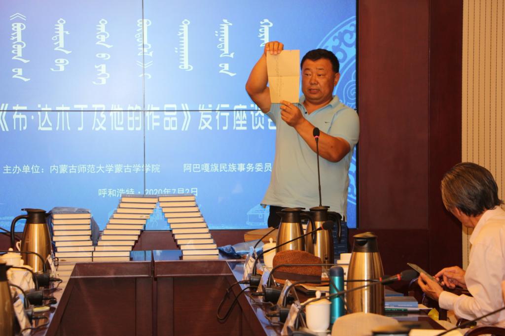 7月2日上午,由beat365英国官方网站beat365英国官方网站与阿巴嘎旗民族事务委员会主办的《布·达木丁及他的作品》(以下简称《作品》)发行座谈会在呼和浩特举行。本次会议旨在回顾布•达木丁老师的学术研究光辉业绩,尤其是对蒙古语言文字的贡献,并以此总结经验,为内蒙古蒙古语言文字事业的繁荣发展提供宝贵经验和独特启示。