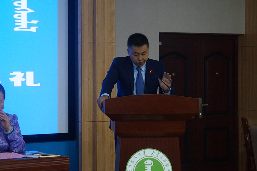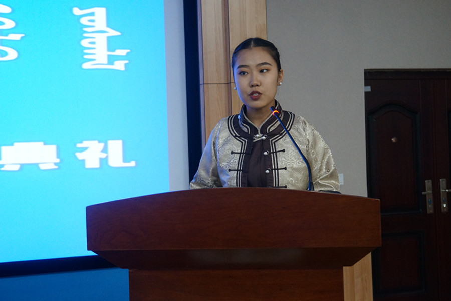 随着雄壮的国歌声仪式开始,白宝成书记代表学院致辞。教师代表、蒙古语言文学系主任元成、班主任代表赵福财、毕业生代表毕力贡格日勒分别发言。随后在校生代表西吉勒、新生本科生代表娜日迈、硕士研究生代表乌义汉、博士研究生代表乌云吉如何也依次发言。